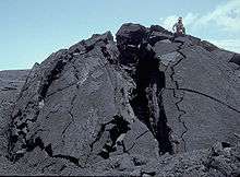 A pressure ridge sometimes referred to as a tumulus (or tumuli in plural form) is created in an active lava flow.[1][2] Formation occurs when the outer edges and surfaces of the lava flow begin to harden.[1] If the advancing lava underneath becomes restricted it may push up on the hardened crust, tilting it outward.[1] Inflation also takes place and is a process where the plastic layer of lava underneath expands as it cools and small crystals form.[1] The end result is a raised mound of hardened lava rock, usually a relatively narrow but long ridge.[1] Tension cracks form on the surface of pressure ridges and run along the axis of elongated ridges, and at both edges of broader ridges, sometimes referred to as pressure plateaus.[1] Sometimes, along the edges of a pressure ridge, the tension crack can be large enough to create a liftup cave.[1] Other caves can form inside pressure ridges when the lava vacates leaving an inflationary cave.[3]