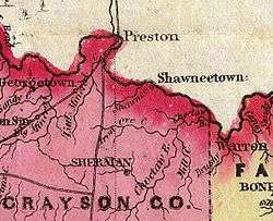 Preston was located in Texas on its border with the Indian Territory (later the state of Oklahoma) in the Red River valley on a river bend just downstream from the river's confluence with the Washita River. The area was also known as Washita Bend or Coffee Bend. This area is located few miles east of the Cross Timbers on the upper Red River above the former Great Raft logjam. A rock bluff overlooked the Red River from on the Texas side of the river, 100–110 feet above the river's low water mark. This bluff at Preston marked the ford of an old Indian trail on the Red River.[19] This ford was later used as the Red River crossing point of the Shawnee Cattle Trail. Later the bluff also marked the return route of Captain Randolph B. Marcy's expedition from Santa Fe to Fort Smith in 1849.[19] The Oklahoma side of the river was a relatively flat sand-covered plain and terraces sloping gently to the river.[20]