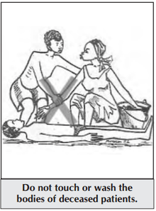 To prepare the body, protective clothing is recommended per usually with a second pair of thick rubber gloves. The body and the area around it is sprayed with 1:10 bleach solution. The body is placed in a “body bag” (mortuary sack) and it is closed securely. The body bag is sprayed with 1:10 bleach solution. The body is then transported to the burial site as soon as possible. Any person who must touch or carry the body during transport should wear the same protective clothing as is worn in the isolation area. The grave should be at least 2 meters deep. Viewing the body is not possible and the burial ceremony should be limited to family only. The interior of the vehicle where the body was carried should be rinsed with 1:10 bleach solution.[1]