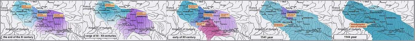 This two significant victories brought nearly one hundred years of relative peaceful development of Halycian principality.[7] Four sons of Rostystlavych Brothers divided the area into four parts with centers in Peremyshl (Rostislav), Zvenyhorod (Volodymyrko), Halych and Terebovlia (Ivan and Yuriy). After the death of three of them Volodimyrko took Peremyshl and Halych and Zvenyhorod gave to Ivan - son of his older brother Rostyslav. In 1141 Volodymyrko moved his residence from Peremyshl to more geographically advantageous Halych giving birth to a united Halycian Principality. In 1145 citizens of Halych, taking advantage of the absence of Volodymyrko, called to reign Ivan of Zvenyhorod. After the defeat of Ivan under the walls of Halych, also Zvenygorod principality was incorporated into the Halycian.
