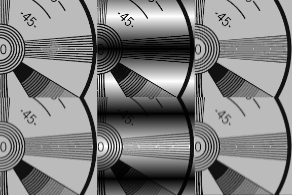This rough animation compares progressive scan with interlace scan, also demonstrating the interline twitter effect associated with interlacing. On the left there are two progressive scan images. In the middle there are two interlaced images and on the right there are two images with line doublers. The original resolutions are above and the ones with spatial anti-aliasing are below. The interlaced images use half the bandwidth of the progressive ones. The images in the center column precisely duplicate the pixels of the ones on the left, but interlacing causes details to twitter. Real interlaced video blurs such details to prevent twittering, but as seen in the pictures of the lower row, such softening (or anti-aliasing) comes at the cost of image clarity. A line doubler shown in the bottom center picture cannot restore the previously interlaced image to the full quality of the progressive image shown in the top left one.