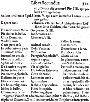 The text on the silver lines below reproduces the original text (including punctuation and orthography) of the 1595 Lignum Vitae, which consisted of three parallel columns for the popes before 1590. The first column contained the motto, the second the name of the pope or antipope to whom it was attached (with occasional errors), and the third an explanation of the motto. There are some indications that both the mottos and explanations were the work of a single 16th century individual.[22] The original list was unnumbered.