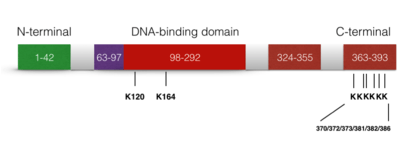 The acetylation of p53 is indispensable for its activation. It has been reported that the acetylation level of p53 will increase significantly when cell undergo stress. There are three major acetylation sites on p53: K164, K120 and C terminus.[32] If only one of the acetylation sites is defected, the activation of p21 is still observed. However, if all three activation sites are blocked, the activation of p21 and the suppression of cell growth caused by p53 will be completely lost. In addition, the acetylation of p53 prevents its binding to the repressor Mdm2 on DNA.[33] In addition, it is suggested that the p53 acetylation is crucial for its transcription-independent proapoptotic functions.[34]