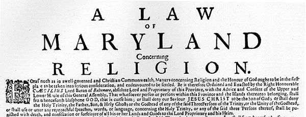 The Protestant Revolution ended Maryland's experiment with religious toleration. Religious laws were backed up with harsh sanctions. In the early 18th century Marylanders who "should utter any profane words concerning the Holy Trinity" would find themselves "bored through the tongue and fined twenty pounds" for a first offence.[10] Maryland established the Church of England as its official church in 1702 and explicitly barred Catholics from voting in 1718.[11]
