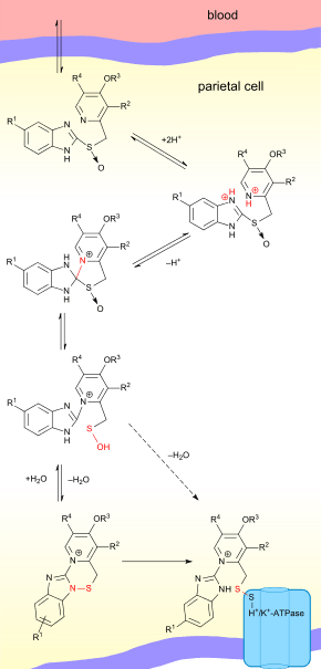 The PPIs are given in an inactive form, which is neutrally charged (lipophilic) and readily crosses cell membranes into intracellular compartments (like the parietal cell canaliculus) with acidic environments. In an acid environment, the inactive drug is protonated and rearranges into its active form. As described above, the active form will covalently and irreversibly bind to the gastric proton pump, deactivating it.