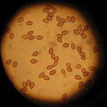 - The spores are (8.2)9.3 — 10.4(13.5) X 6 — 7.1(7.7) x 5.5 — 6.6 µm, subrhomboid in face view, subellipsoid in side view, with a hilar appendage visible and a truncate apex with a broad germ pore, thick walled, and dingy yellow brown.