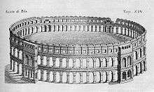 In classical antiquity, it was inhabited by the Histri,[8] a Venetic or Illyrian tribe recorded by Strabo in the 1st century AD The Istrian peninsula was conquered by the Romans in 177 BC,[8] starting a period of Romanization. The town was elevated to colonial rank between 46–45 BC as the tenth region of the late Roman Republic, under Julius Caesar.[8][9] During that time the town grew and had at its zenith a population of about 30,000. It became a significant Roman port with a large surrounding area under its jurisdiction. During the civil war of 42 BC of the triumvirate of Octavian, Mark Antony and Lepidus against Caesar's assassins Brutus and Cassius, the town took the side of Cassius, since the town had been founded by Cassius Longinus, brother of Cassius. After Octavian's victory, the town was demolished. It was soon rebuilt at the request of Octavian's daughter Iulia and was then called Colonia Pietas Iulia Pola Pollentia Herculanea. The colony was part of Venetia et Histria, a region of Roman Italy. Great classical constructions were built of which a few remain. A great amphitheatre, Pula Arena, was constructed between 27 BC – 68 AD,[10] much of it still standing to this day. The Romans also supplied the city with a water supply and sewage systems. They fortified the city with a wall with ten gates. A few of these gates still remain: the triumphal Arch of the Sergii, the Gate of Hercules (in which the names of the founders of the city are engraved) and the Twin Gates. During the reign of emperor Septimius Severus the name of the town was changed into "Res Publica Polensis". The town was the site of Crispus Caesar's execution in 326 AD and Gallus Caesar's execution in 354 AD. In 425 AD the town became the centre of a bishopric, attested by the remains of foundations of a few religious buildings.[8]