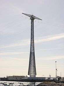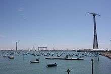 The Pylons of Cádiz, also known as the Towers of Cádiz, are two tall pylons supporting a double-circuit 132 kV three-phase AC powerline[1] over the bay of Cádiz, Spain starting at Puerto Real Substation[Location 1] to the substation of the former Cadiz Thermal Power Station situated on the peninsula upon which the city of Cádiz stands.[Location 2]
