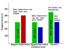 Fever: Characterized on the right: Normal body temperature is shown in green. It reads "New Normal" because the thermoregulatory set point has risen. This has caused what was the normal body temperature (in blue) to be considered hypothermic.