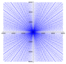 Note, for example, that (6, 8, 10) is not a primitive Pythagorean triple, as it is a multiple of (3, 4, 5). Each of these low-c points forms one of the more easily recognizable radiating lines in the scatter plot.
