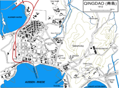 In 1891, the Qing government decided to make coastal Tsingtao (Jiao'ao) a defense base against naval attack and began to improve Qingdao's existing fortifications. German naval officials observed and reported on this Chinese activity during a formal survey of Jiaozhou Bay in May 1897. Subsequently, German troops seized and occupied the fortification.[9] China conceded the area to Germany the following year, and the Kiautschou Bay concession, as it became known, existed from 1898 to 1914 (Li 2005, p. 81). With an area of 552 square kilometres (136,000 acres; 213 sq mi), it was located in the imperial province of Shandong (alternately romanized as Shantung or Shan-tung) on the southern coast of the Shandong Peninsula in northern China. Jiaozhou was romanized as Kiaochow, Kiauchau or Kiao-Chau in English and Kiautschou in German. Qingdao was its administrative center. "The so-called Marktstrasse (Market street) was nothing more than the old main street of the Chinese village of Tsingtao, and the buildings lining it were the former homes of fishermen and farmers. Having sold their property, they resettled their homes and fields in the villages further east."[10] Upon gaining control of the area, the Germans outfitted the impoverished fishing village of "Tsingtao" (Qingdao) with wide streets, solid housing areas, government buildings, electrification throughout, a sewer system and a safe drinking water supply, a rarity in large parts of Asia at that time and later.[11] The area had the highest school density and the highest per capita student enrollment in all of China, with primary, secondary and vocational schools funded by the Imperial German treasury and Protestant and Roman Catholic missions.[11] Commercial interests established the Germania Brewery in 1903, which later became the world-famous Tsingtao Brewery.[12] German influence extended to other areas of Shandong Province, including the establishment of diverse commercial enterprises.