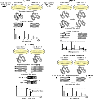 For quantitative MS, a commonly applied approach is isotope-coded affinity tags (ICAT), which uses two reagents with heavy and light isotopes, respectively, and a biotin affinity tag to modify cysteine containing peptides. This technology has been used to label whole Saccharomyces cerevisiae cells,[4] and, in conjunction with mass spectrometry, helped lay the foundation of quantitative proteomics.
