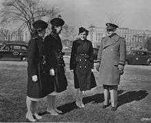 Quartermaster General Maj Gen Gregory discusses Army nurses' clothing with Lt. Alice Montgomery, Lt. Josephine Etz, and Lt. Leophile Bouchard, of Walter Reed Hospital. The Quartermaster General is responsible for supplying all branches of the Army.