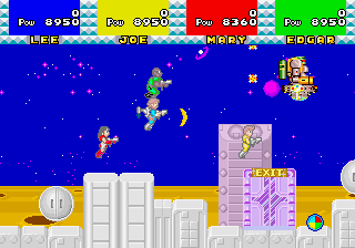 Players can find various power-ups during play, such as a jet pack that allowed characters to stay airborne, springs to jump higher, speed boots, and point bonuses. Each character has a separate characteristic weapon type, which can be upgraded by picking up a coloured bouncing orb that bounced across the screen occasionally. Picking up the orb when it is a player's colour gives a weapon power up, while picking up the orb when it is another player's color gives a point bonus (but deprives the other player the chance to upgrade).