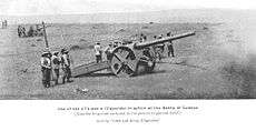 Scott then improvised a travelling carriage for 4.7 inch guns removed from their usual static coastal or ship mountings to provide the army with a heavy field gun. These improvised carriages lacked recoil buffers and hence in action drag shoes and attachment of the carriage by cable to a strong point in front of the gun were necessary to control the recoil.[6] They were manned by Royal Navy crews and required up to 32 oxen to move.[6]