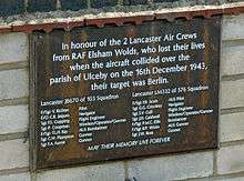 Royal Air Force Station Elsham Wolds or more simply RAF Elsham Wolds is a former Royal Air Force station in England, which operated in the First World War and the Second World War. It is located just to the north east of the village of Elsham in north Lincolnshire.[1]