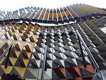 - Façade is composed of external panels and triangular elements, which provide different degrees of shading, based on the orientation of the building.