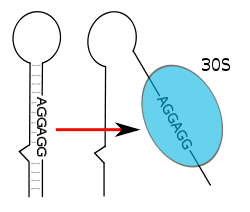 RNA thermometers are found in the 5' UTR of messenger RNA, upstream of a protein-coding gene.[1] Here they are able to occlude the ribosome binding site (RBS) and prevent translation of the mRNA into protein.[13] As temperature increases, the hairpin structure can 'melt' and expose the RBS or Shine-Dalgarno sequence to permit binding of the small ribosomal subunit (30S), which then assembles other translation machinery.[1] The start codon, typically found 8 nucleotides downstream of the Shine-Dalgarno sequence,[13] signals the beginning of a protein-coding gene which is then translated to a peptide product by the ribosome. In addition to this cis-acting mechanism, a lone example of a trans-acting RNA thermometer has been found in RpoS mRNA where it is thought to be involved in the starvation response.[1]