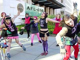Radical cheerleading is a form of cheerleading performed at demonstrations that combines elements of non-violent direct action and street theater.[1] It originated in 1996[2] in Miami, Florida,[3] and there are now many radical cheerleading squads in the United States as well as Canada and Europe. Radical cheerleaders reappropriate the aesthetics of cheerleading, sometimes in an ironic fashion, and use cheers that promote feminism and left-wing causes.[4] Radical cheerleaders subvert gender norms through costuming and may be male, transgender or non-gender identified.[5] Feminist magazine director Lisa Jervis places radical cheerleading within a tradition of playful feminist comment on popular culture.[6]