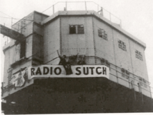 In 1964, following the launch of Radio Caroline, Screaming Lord Sutch said he would start his own station. On 27 May Radio Sutch began broadcasting on 194 metres (announced as 197), 1542 kHz, from the south tower of Shivering Sands. It was a low-powered, low-budget operation. The transmitter, from a Handley Page Halifax bomber, was powered with a cascade of car batteries, a scaffold pole with a skull-and-crossbones flag as an antenna.[2] By September 1964 Sutch had become tired of it and sold it to his manager Reginald Calvert for a reported £5,000.[3] Calvert bought new equipment and expanded the station into other towers. One of the original seven towers had been destroyed when a ship collided with it, leaving the northernmost tower isolated. The remaining five were connected by catwalks in an irregular star shape. Calvert's team repaired the catwalks and refurbished the facilities and living quarters. New studios were built, a more powerful transmitter installed, and the station experimented with new antenna configurations and frequencies (1034 and eventually 1003 kHz). Initially antenna wires were strung around the periphery of the towers. This was unsuccessful due to poor insulation. Later a vertical mast was erected on the central tower, supported by guy wires on three of the surrounding towers, and the station adopted the nickname "your tower of power". Although output never exceeded 2 kW, the efficiency of the antenna combined with its location over water (a reflector of radio waves) gave it the coverage of a more powerful land-based station, and Radio City claimed a power of 10kW for the purpose of attracting advertisers.