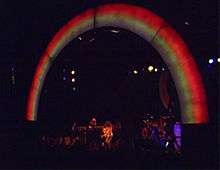 This line-up also commenced the first world tour for the band, with the first date in Montreal on 10 November 1975. The centrepiece of the band's live performance was a computer-controlled rainbow including 3,000 lightbulbs, which stretched 40 feet across the stage.[19] [18] A second album, Rising, was recorded in February at Musicland. By the time of the European dates in the summer of 1976, Rainbow's reputation as a blistering live act had been established. The band added Deep Purple's "Mistreated" to their setlist, and song lengths were stretched to include improvisation.[20] Carey recalls rehearsing the material was fairly straightforward, saying "We didn't work anything out, except the structure, the ending ... very free-form, really progressive rock."[21] The album art was designed by famed fantasy artist Ken Kelly, who had drawn Tarzan and Conan the Barbarian.[22][23]