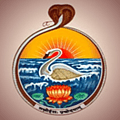 Designed and explained by Swami Vivekananda given in his own words: The wavy waters in the picture are symbolic of Karma; the lotus, of Bhakti; and the rising-sun, of Jnana. The encircling serpent is indicative of Yoga and the awakened Kundalini Shakti, while the swan in the picture stands for Paramatman (Supreme Self). Therefore, the idea of the picture is that by the union of Karma, Jnana, Bhakti and Yoga, the vision of Paramatman is obtained.