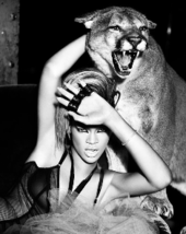 On October 8, 2009, Rihanna shot promotional pictures in Berlin in a nude body suit and white fur coat.[46][47] The photos were initially thought to be on the front cover or booklet of the album.[47] The final image from the photoshoot for the album was made by fashion photographer Ellen von Unwerth, who stated that Rihanna was looking to create "something a bit new for the look of the album."[48] Von Unwerth, who has also shot other album covers such as The Velvet Rope (1997) by Janet Jackson, Back to Basics (2006) by Christina Aguilera, and Blackout (2007) by Britney Spears,[48] went on to say that Rihanna was involved in every aspect of the shoot and was ready to push content boundaries.[48] The album cover was released on October 27, 2009 and features Rihanna in a moody, contemplative pose wearing a leather top with her hand covering her right eye and each finger wrapped in an intricate set of rings.[48] The black-and-white cover was compared to the 1980s album covers by singer Grace Jones.[48]