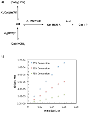 - ↑ The mechanistic scheme and kinetic data are adapted from independent kinetic simulations using the rate and equilibrium constants reported for the amino-thiourea catalyzed cyanosilylation of ketones by Zuend, S. J.; Jacobsen, E. N. J. Am. Chem. Soc. 2007, 129, 15872.