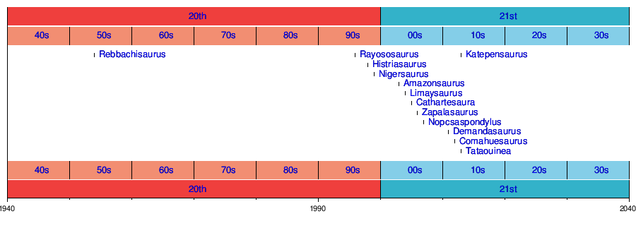 So far, rebbachisaurids are known only from the middle and early part of the Late Cretaceous. Unless the nemegtosaurids are in fact diplodocoids (rather than titanosaurs), then the rebbachisaurids represent the last known representatives of this clade, and lived alongside the titanosaurs until fairly late in the Cretaceous. So far, no rebbachisaurids are known from the very end of the Cretaceous period.