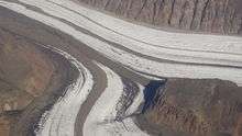 A medial moraine is a ridge of moraine that runs down the center of a valley floor. It forms when two glaciers meet and the debris on the edges of the adjacent valley sides join and are carried on top of the enlarged glacier. As the glacier melts or retreats, the debris is deposited and a ridge down the middle of the valley floor is created. The Kaskawulsh Glacier in the Kluane National Park, Yukon, has a ridge of medial moraine 1 km wide.