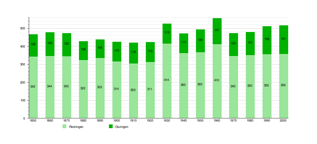 Reckingen-Gluringen has a population (as of December 2015) of 436.[2] As of 2008, 6.9% of the population are resident foreign nationals.[7] Over the last 10 years (1999–2009 ) the population has changed at a rate of -13.9%. It has changed at a rate of -7.4% due to migration and at a rate of -3.3% due to births and deaths.[6]