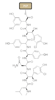 Nonribosomal peptide synthesis occurs through distinct modules that can load and extend the protein by one amino acid through the amide bond formation at the contact sites of the activating domains.[38] Each module typically consists of an adenylation (A) domain, a peptidyl carrier protein (PCP) domain, and a condensation (C) or elongation domain. In the A domain, the specific amino acid is activated by converting into an aminoacyl adenylate enzyme complex attached to a 4'phosphopantetheine cofactor by thioesterification[39][40] The complex is then transferred to the PCP domain with the expulsion of AMP. The PCP domain uses the attached 4'-phosphopantethein prosthetic group to load the growing peptide chain and their precursors.[41] The organization of the modules necessary to biosynthesize Vancomycin is shown in Figure 1. In the biosynthesis of Vancomycin, additional modification domains are present, such as the epimerization (E) domain, which isomerizes the amino acid from one stereochemistry to another, and a thioesterase domain (TE) is used as a catalyst for cyclization and releases of the molecule via a thioesterase scission.
