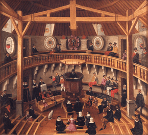 From the end of the sixteenth century through the eighteenth century, a period known as Reformed orthodoxy, Reformed baptismal theology further developed the covenantal meaning of baptism.[15] Theologians more carefully defined the sacramental union of baptism, or the relationship between the outward washing with that which it signifies.[16] In the high orthodox period (middle to late seventeenth century), theologians such as Hermann Witsius expanded the covenantal meaning of baptism using analogies such as Noah's Ark and the crossing of the Red Sea, which carried the theological themes of the resurrection and eternal life. This period also saw the emergence of Reformed Baptists. Reformed Baptist theologians had much in common with the Reformed, but saw baptism as a sign of the baptized's fellowship with Christ rather than a sign and seal of the covenant of grace, and as a result did not baptize their children.[17]