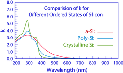 Example 1 shows one broad maximum in the n(λ) and k(λ) spectra of the a-Si film, as is expected for amorphous materials. As a material transitions toward crystallinity, the broad maximum gives way to several sharper peaks in its n(λ) and k(λ) spectra, as demonstrated in the graphics.