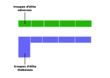 The first recorded use of a tactic similar to the oblique order was at the Battle of Leuctra, in Greece, when the Thebans under Epaminondas defeated the Spartans by highly enforcing one flank to fifty rows deep, rather than spread forces parsimoniously.[9] Philip of Macedon while held prisoner at Thebes would have learnt Epaminondas' technique, and his descendants, including Alexander the Great, used its variations in their campaigns. The classical writer Vegetius was the first known to write about the tactic that became the oblique order of battle.[10]