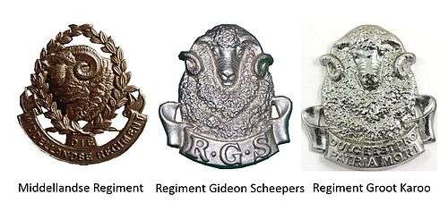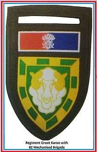 Regiment Groot Karoo was established in 1934 as one of the new Afrikaans language Citizen Force units of the Union Defence Force.[1] Regiment Groot Karoo has changed it name over its operational lifespan, it was initially referred to as the Middellandse Regiment, then Regiment Gideon Scheepers and finally the regiment Groot Karoo.