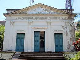 Comtean Positivism was relatively popular in Brazil. In 1881 Miguel Lemos and Raimundo Teixeira Mendes organized the "Positivist Church of Brazil." In 1897 the "Temple of Humanity" was created.[5] The services at the Temple could go on for up to four hours and that, combined with a certain moral strictness, led to some decline during the Republican period.[6] Nevertheless it had appeal with the military class as Benjamin Constant joined the group before breaking with it because he deemed Mendes and Lemos as too fanatical. Cândido Rondon's conversion proved more solid as he remained an orthodox Positivist and a member of the faith long after the church's importance waned.[7] Although declined, the church still survives in Brazil. The national flag of Brazil bears the "Ordem e Progresso" ("Order and Progress"), inspired by Comte's motto of positivism: "L’amour pour principe et l’ordre pour base; le progrès pour but" ("Love as a principle and order as the basis; progress as the goal").[8]