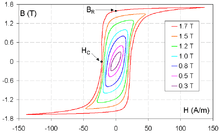 Fig. 1 A family of AC hysteresis loops for grain-oriented electrical steel (Br denotes remanence and Hc is the coercivity).