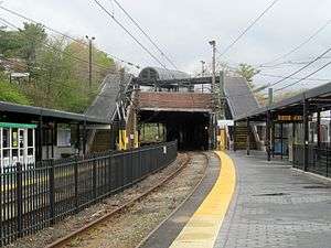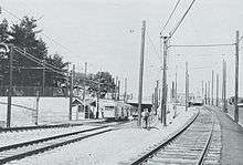 On May 31, 1958, the line was closed for rebuilding; it reopened on July 4, 1959 as a branch of the M.T.A. streetcar system.[1][8] The 1888 station building was removed to make space for the new station and connecting yard tracks.[9] When the line was converted for light rail use, it was assumed that most traffic would come from the inner part of the line, and thus an overhead loop was built connecting the line to Chestnut Hill Avenue. However, the outer half of the line proved more popular than expected, and Reservoir short turns were later reduced, with some extra short turn service remaining at times during rush hour.[8]