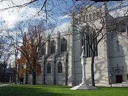 The Princeton University Chapel is located on the north side of campus, near Nassau Street. It was built between 1924 and 1928, at a cost of US$2.3 million,[67] approximately US$31.7 million in 2015 dollars. Ralph Adams Cram, the University's supervising architect, designed the Chapel, which he viewed as the crown jewel for the Collegiate Gothic motif he had championed for the campus.[68] At the time of its construction, it was the second largest university chapel in the world, after King's College Chapel, Cambridge.[69] It underwent a two-year, US$10 million restoration campaign between 2000 and 2002.[70]
