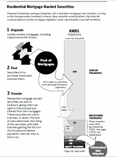 While private-label subprime mortgages would never be able to make that claim, by "slicing" the pooled mortgages into "tranches", each having a different priority in the stream of monthly or quarterly principal and interest stream,[22][23] they could create triple A rated securities from the tranches with the highest priority — the most "senior" tranches.