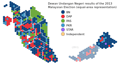 Equal-area representation of the results with each hexagon representing one seat