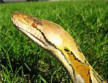 The reticulated python (Python reticulatus)[1] is a species of python found in Southeast Asia. They are the world's longest snakes and longest reptiles and among the three heaviest snakes. Like all pythons, they are nonvenomous constrictors and normally not considered dangerous to humans. Although large specimens are powerful enough to kill an adult human, attacks are only occasionally reported.