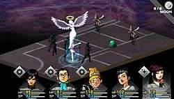 Battles take place on a grid-based battle arena, with characters and enemies moving according to their position on the grid. Four commands are available to the party: Attack (fight enemies), Contact (talk with an enemy), Analyze (check an enemy for its strength and weaknesses), and Form (rearrange the party on the grid). The character's main means of attack is their Persona, beings summoned into battle to cast a spell that can heal the party, and inflict physical or elemental damage on an enemy. Each Persona has access to up to eight skills, and each character can change their Persona during their turn. Personas earn experience points independent of the characters they are assigned to, and gain new abilities through extended use.[2][5][6][7] Experience is awarded based on how often the player uses certain characters or Personas.[7] Alongside their Personas, each character is able to attack with an equipped melee weapon or firearm, use an item, or attempt to talk with the demons that act as the game's standard enemies.[8]