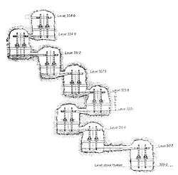Another device which was used widely was the Archimedean screw, and examples of such drainage machines have also been found in many old mines. Depictions show the screws being powered by a human treading on the outer casing to turn the entire apparatus as one piece. They were also used in series, so increasing the lift of water from the workings. However, they must have been more difficult to operate since the user had to stand on a slanting surface to turn the screw. The steeper the incline, the greater the risk of the user slipping from the top of the screw. No doubt the reverse water wheel was easier to use with a horizontal treading surface. On the other hand, the screw could be operated by a crank handle fitted to the central axle, but would be more tiring since the weight of the operator does not bear on the crank, as it does when trod from above.