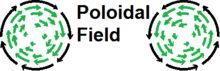 A reversed-field pinch (RFP) is a device used to produce and contain near-thermonuclear plasmas. It is a toroidal pinch which uses a unique magnetic field configuration as a scheme to magnetically confine a plasma, primarily to study magnetic fusion energy. Its magnetic geometry is somewhat different from that of the more common tokamak. As one moves out radially, the portion of the magnetic field pointing toroidally (see inset) reverses its direction, giving rise to the term "reversed field". This configuration can be sustained with comparatively lower fields than that of a tokamak of similar power density. One of the disadvantages of this configuration is that it tends to be more susceptible to non-linear effects and turbulence. This makes it a perfect laboratory for non-ideal (resistive) magnetohydrodynamics. RFPs are also used in the study of astrophysical plasmas as they share many features.