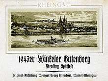 A Riesling 1943 wine label from Winkel. A steam boat on the Rhine.