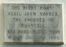 The Rhodes Arts Complex & Bishop's Stortford Museum is a museum and contemporary venue for arts, culture and conferences in Bishop's Stortford, Hertfordshire, England. One of the buildings, Netteswell House, was the birthplace of Cecil Rhodes, financier, statesman and founder of diamond company De Beers.[1] The Rhodes Birthplace Trust is a registered charity under English law.[2]