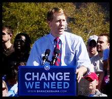 Cordray announced his 2008 candidacy for Ohio state attorney general on June 11, 2008. He was endorsed by Ohio Governor Ted Strickland.[72][73] The vacancy in the office of the attorney general was created by the May 14, 2008, resignation of Marc Dann who was embroiled in a sex scandal.[73][74][75] Several leading Republican party contenders such as Montgomery, Jim Petro, DeWine, Maureen O'Connor, and Rob Portman declined to enter the race.[73][76] Cordray's opponents in the race were Michael Crites (Republican), and Robert M. Owens (Independent).[77] Cordray had a large financial advantage over his opponents with approximately 30 times as much campaign financing as Crites.[78] Crites' campaign strategies included attempts to link Cordray with Dann—an association The Columbus Dispatch called into question[79]—and promoting himself as having more years of prosecutorial experience.[80] Cordray asserted that he managed the state's money safely despite the turbulence of the financial crisis of 2007–2008.[81][82]