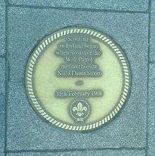 The first recorded Scout meeting took place at Fortune's home at 3 Dame Street, Dublin on 15 February 1908 where four boys were enrolled in the Wolf Patrol of the 1st Dublin Troop. Fortune's 1st Dublin Troop would go on to become the first group to register as part of the Port of Dublin Sea Scout Association in 1912, becoming 1st Port of Dublin Sea Scouts (Ringsend). A plaque marks the location of the house, now demolished, on the plaza next to Dublin’s City Hall. The 2nd Dublin formed the following week at 5 Upper Camden Street.[6]